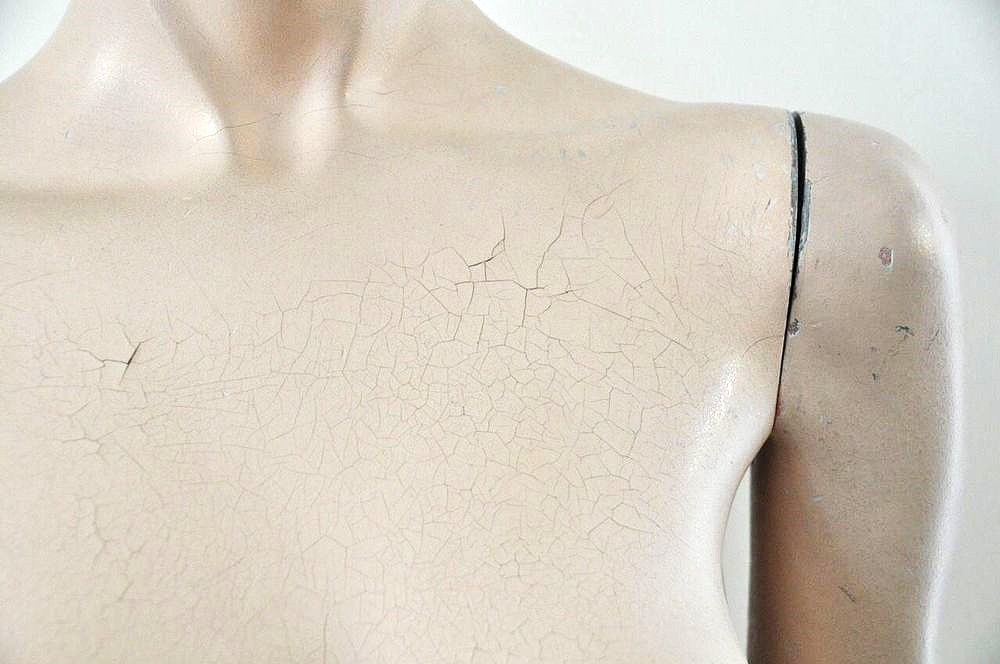 Ein aussagekräftiges Foto von den Schäden bei einer alten Schaufensterpuppe sagt viel über den Allgemeinzustand und den Wert der Figur, aber auch viel über die Ehrlichkeit des Verkäufers aus. Nicht selten werden Schäden nicht deklariert und in manchen Fällen verheimlicht. Beim Verkäufer dieser Figur war es genau umgekehrt: sehr transparent. Lackabplatzer und altersbedingte Haarrisse an Oberarmen und im Bereich der Brustpartie und angrenzende Zonen (Bild).