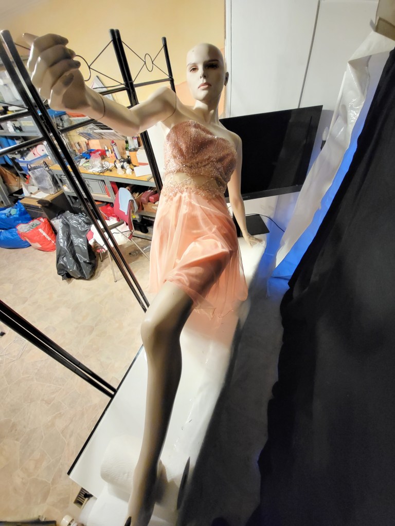 Lynne zusammengesetzt, angekleidet und in Position gebracht. Schuhe und Perücke fehlen noch.