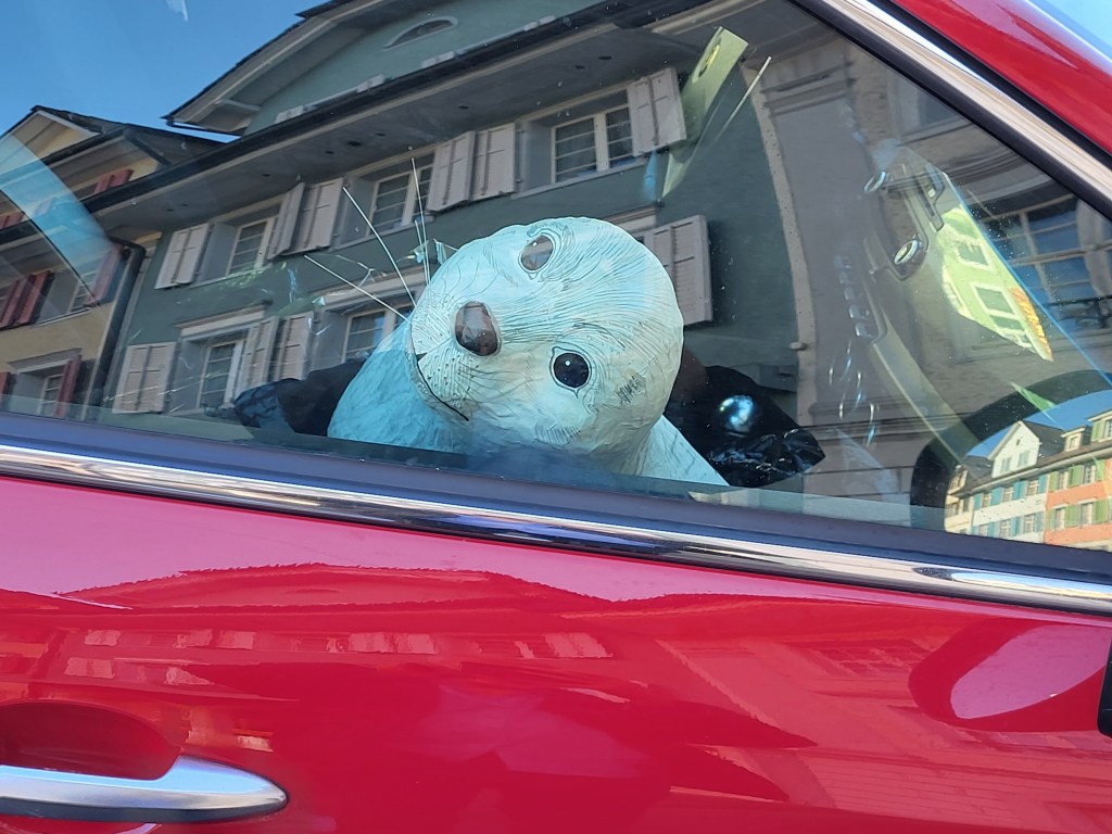 Herzensbrecher Nr. 02: die Robbe, hier auf meinem Beifahrersitz, kann ihren ersten Einsatz im Schaufenster kaum erwarten.