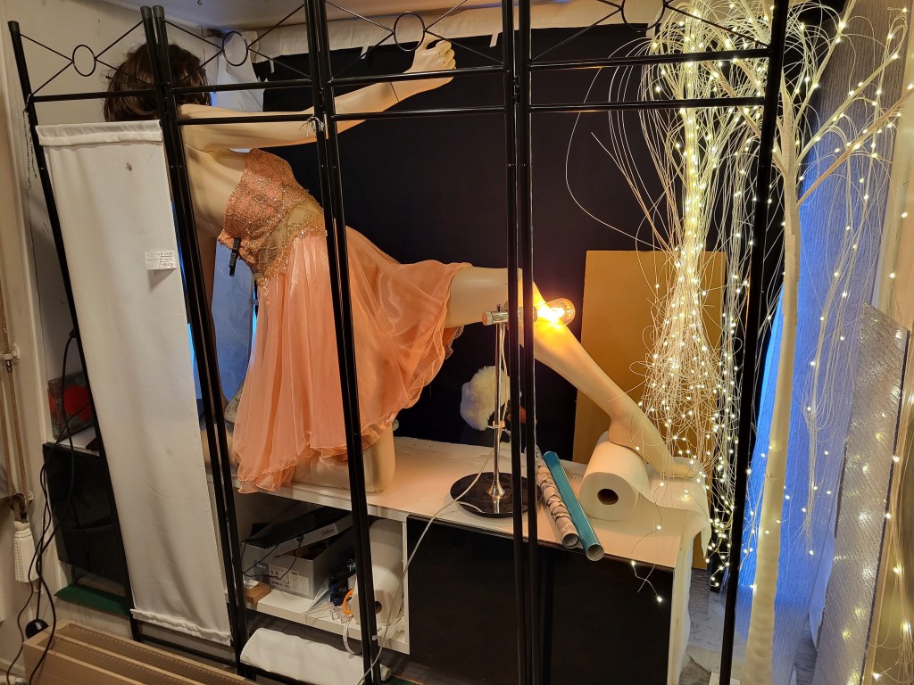 Die weisse Trauerweide mit Lichterketten vom Landi im Ausverkauf bringt mit viel Licht und Glitzer einen zusätzlichen Glanz in die gesamte Atmosphäre. Blick von der Rückseite des Schaufensters während der Installation….
