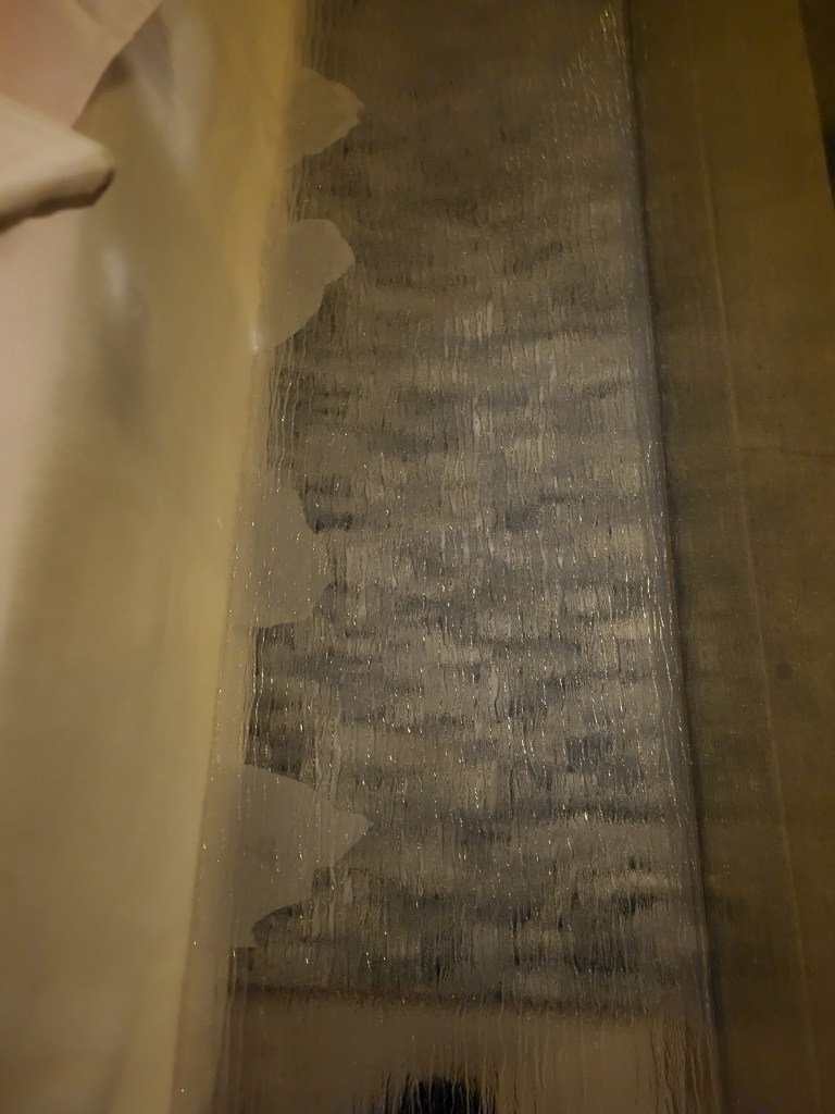 Testserie, um den perfekten Abstand zwischen der Plexiglasplatte, deren Struktur gefrorenes Eis nachahmt, und der Platte mit dem Kiesbett zu finden. Je näher, desto unnatürlicher wirkt die Tiefe des Sees und je weiter weg die Eisplatte vom Kies ist, desto weniger sieht man durch die entstehende Unschärfe, was sich am Boden befindet. Very tricky!!!