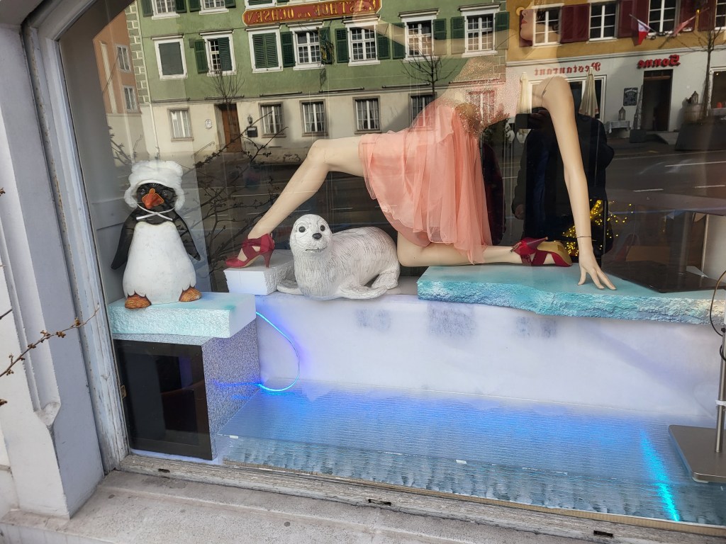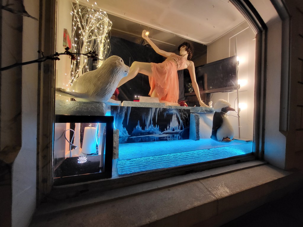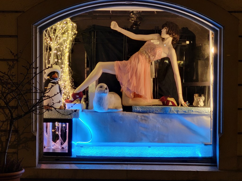 Natürlich wolle ich mit Lynne einmal ein Schaufenster machen. Sie ist so toll! Diese Dynamik in der Bewegung; tänzerisch. „Let’s Dance“ im Fernsehen. Ich schaue jede Staffel. Motsi, Jorge, Herr Llambi: Kult. Glitzerwelten pur, diese Bühnen phantastisch, die Kleider einfach umwerfend schön. Lynne Guerney von Adel Rootstein aus der Serie „Point and Counterpoint“ mit der Nummer CP 07 passt perfekt in diese Traumwelt hinein – und als ich mir überlegte, welche Schaufensterpuppe in meine „Antarctica Parad-ice“-Idee hineinpassen würde, gab es eine Vorauswahl von fünf, sechs Mannequins (aus rd. 400, die mir zur Verfügung stehen). Aber Lynne schaffte es ins Finale, selbst wenn sie eine von jenen Schaufensterpuppen ist, die ganz schwierig ist ohne fremde Hilfe zu bekleiden. Es gibt einen Trick, den muss man kennen. Sonst fällt sie um und erleidet Schaden.