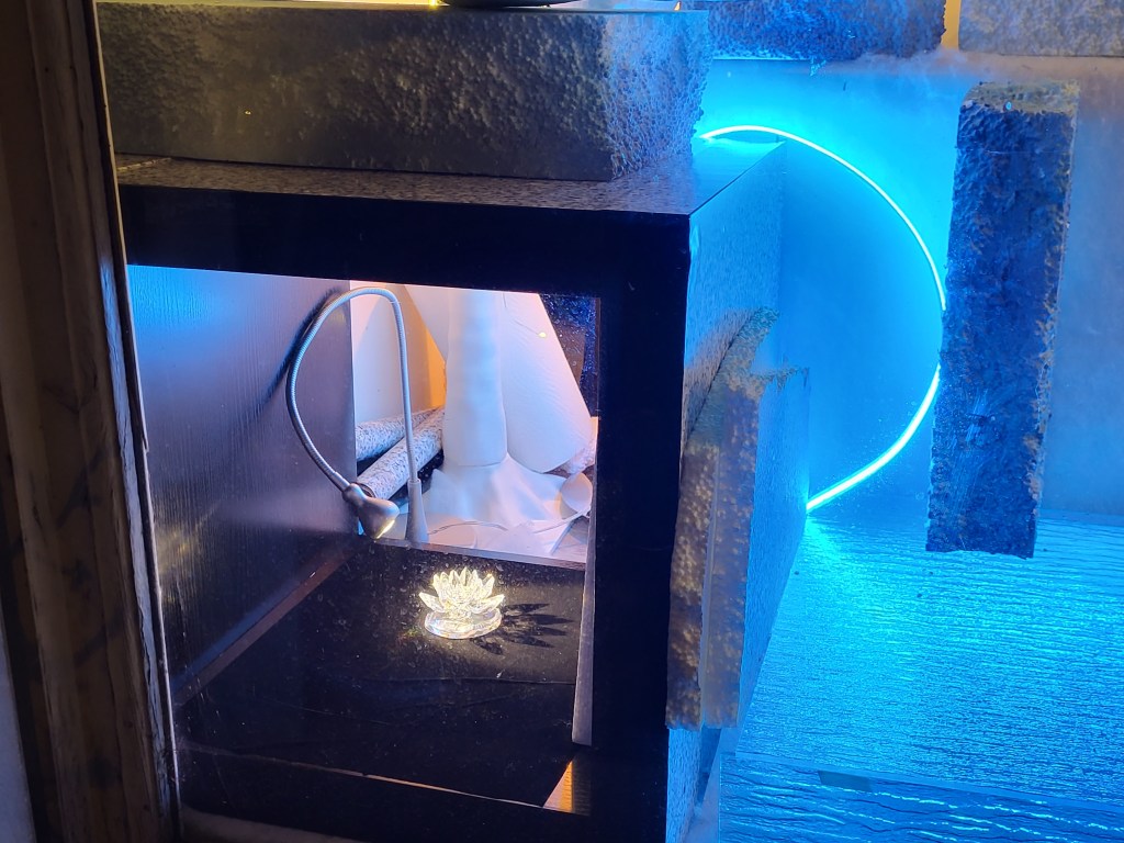 Auf einer Samtunterlage positionierte ich die Swarovski-Seerose aus Kristallglas, die ich mit einem Spot zur Geltung brachte.