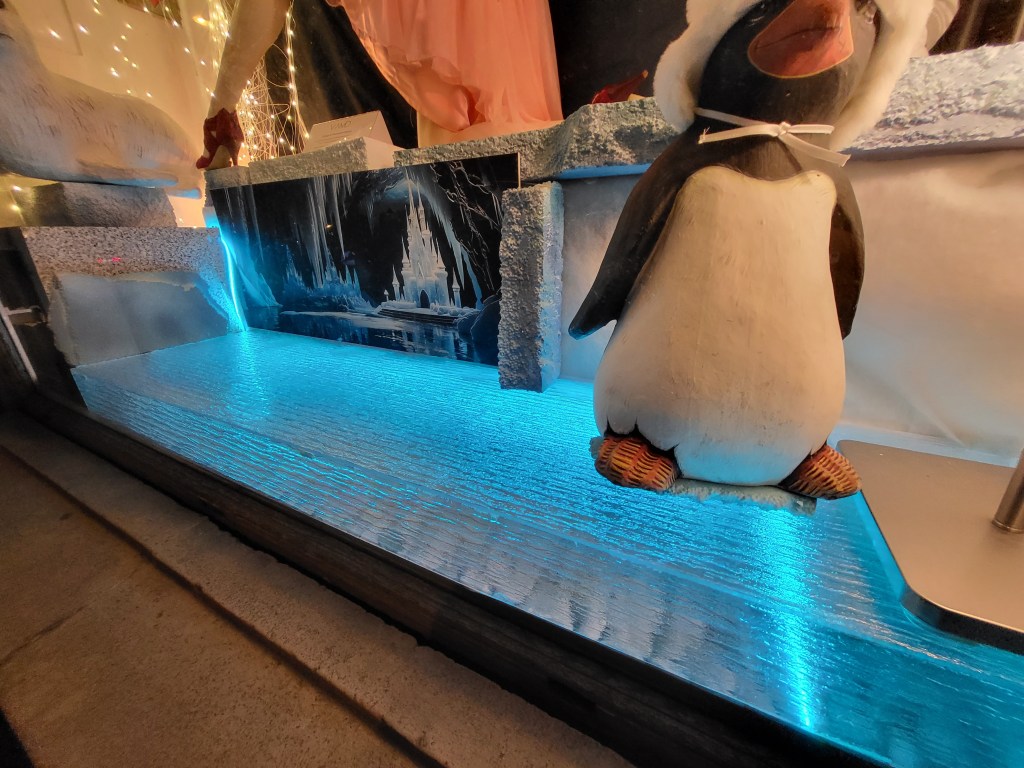 Youtube-Video, Szene 01, mit KI erstellt: Lynne steht auf und begleitet einen Pinguin zur Seite des Schaufensters.