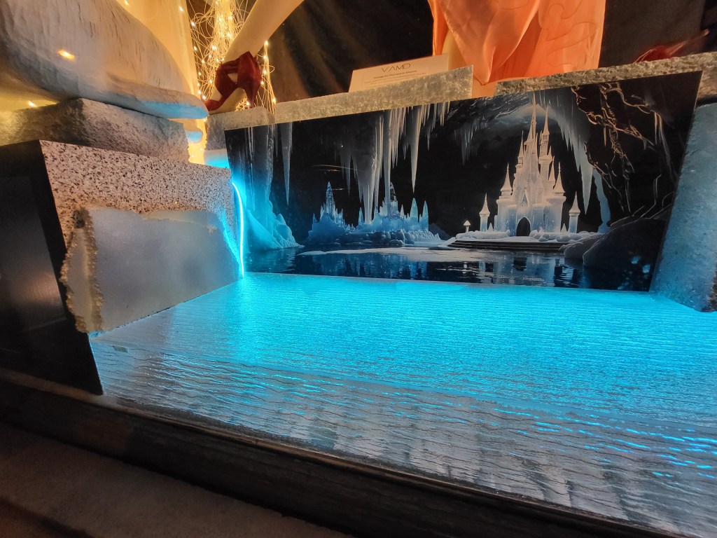 „Parad-ice“: zugefrorenes Polar-Eismeer mit steinigem Untergrund. Die blaue Farbe des LED-Lichtstrangs habe ich nachträglich den Farben auf dem Bild angepasst, welches ich mit KI (Künstliche Intelligenz) auf dem Computer anfertigte, bei Ifolor drucken liess und auf eine Spezialplatte aufzog. Es stellt eine glitzernde Unterwelt dar, mit einem Schloss aus Eis, Bergkristallen und einem teils zugefrorenen, unterirdischen See.