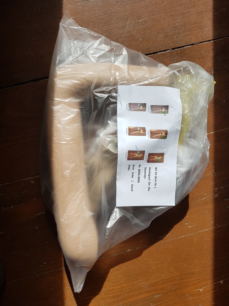 Wichtiges und notwendiges Ersatzteil in einer meiner Kisten: linker Arm mit Hand, der für eine Hindsgaul „On the seaways“ mit den Nummern 8004 – 8006 passend wäre. So bekam meine 8006 zunächst den richtigen linken Arm mit Hand.