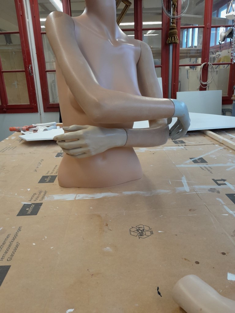 Da wurde geputzt, geschliffen und gespachtelt. Ich gab die Farbe, das Makeup und die finale Armstellung vor, für die ich aber mehrere Monate brauchte und stundenlang in meinem Ersatzteilarchiv nach passenden Teilen suchte. Schon nach kurzer Zeit fand ich zumindest den linken, passenden Arm mit Hand, den ich in einer Plastiktüte schön säuberlich angeschrieben in einer der Kisten mit Teilen entdeckte.