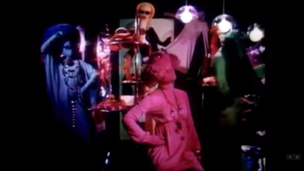 Einfach fantastisch und absolut sehenswert, alleine schon durch die leider in die Jahre gekommenen und etwas unscharfen, traumähnlichen, berauschenden Bilder, die einem an die psychodelischen Rock- und Pop-Musikclips der 60er- und 70er-Jahre erinnert. Der Werbefilm aus dem Jahre 1970 hält natürlich dem Vergleich mit neueren Produktionen nicht stand. Aber genau dieses Feeling der damaligen Zeit, welches ich selber erleben durfte und das dem späteren Musical und Kult-Film „Hair“acht Jahre danach vorweggenommen scheint, kommt in gewisser Weise perfekt zum Ausdruck; bild-, schnitt- und musiktechnisch für mich ein avantgardistisches Meisterwerk, bewusst tiefgründig etwas ironisch, überzeichnet, vor allem mit den pantomimenhaften Bewegungen der lebendig gewordenen Schaufensterpuppen der Unvollkommenheit ihren Raum lassend. Wenn man genau hinschaut, entdeckt man dieses „Glanzlicht“ in den Szenen, wo die vordere rote Figur bei der Drehung nach links um die eigene Achse, diese typische, für damalige Verhältnisse provokative Twiggy-Pose (siehe Bild unten) einen kurzen Moment lang einnimmt.