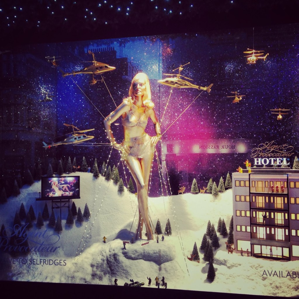 Als ich gestern dieses aussergewöhnliche Foto von der Weihnachtsdekoration der Edel-Boutique für Unterwäsche „Agent Provocateur“ im Internet entdeckte, musste ich zuerst ein wenig schmunzeln, denn als Kind, wie damals vor dem „Franz Carl Weber“, hätte ich zuerst die Helikopter im Fokus meiner Blicke und diese zuoberst auf der Wunschliste gehabt. Auch die Tännchen und die Figuren hätten vor einigen Jahrzehnten perfekt auf meine selber aufgebaute Eisenbahnanlage gepasst. Aber gestern fiel mein Blick natürlich zuerst auf die goldene Karen Mulder von Adel Rootstein und ich merkte, dass sie vor meinem inneren Auge blitzschnell, vorbei an allen Helikoptern, Spielfiguren und Tännchen vorüber an die Spitze von meiner imaginierten Wunschliste rückte. Jaja, meine lieben Leserinnen und Leser dieses Blogs: so ändern sich mit den Jahren die Prioritäten! Und so wie ich als Kind eine ganze Flotte von Feuerwehrautos und Helikoptern herbeisehnte, so würde ich heute diese wunderschöne, goldene Schaufensterfigur (wenn es sein muss mit den Helikoptern) mit nach Hause nehmen…. So hat diese, wovon ich bereits seit einigen Jahren ein Exemplar besitze, einen speziellen Platz, wo ich täglich mehrmals an ihr vorbei gehe, sie bewundere und mich gerne daran erinnere, wie ich als Kind mit meinem Feuerwehrauto und heute mit meiner goldenen Karen Mulder, von Adel Rootstein aus der Serie „Seduction“ glücklich bin.