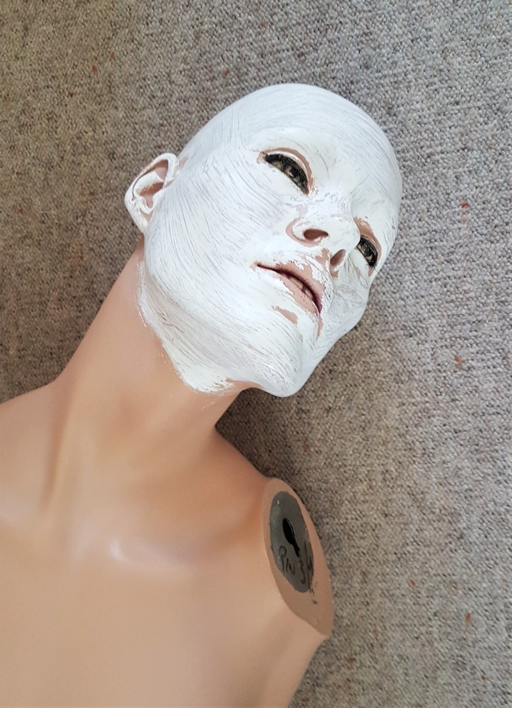 Beim waschen der Schaufensterpuppe, verlor sie die oberste Farbschicht aus (wasserlöslichem) Acryl und darunter kam eine weisse Schicht mit Ölfarbe zum Vorschein.