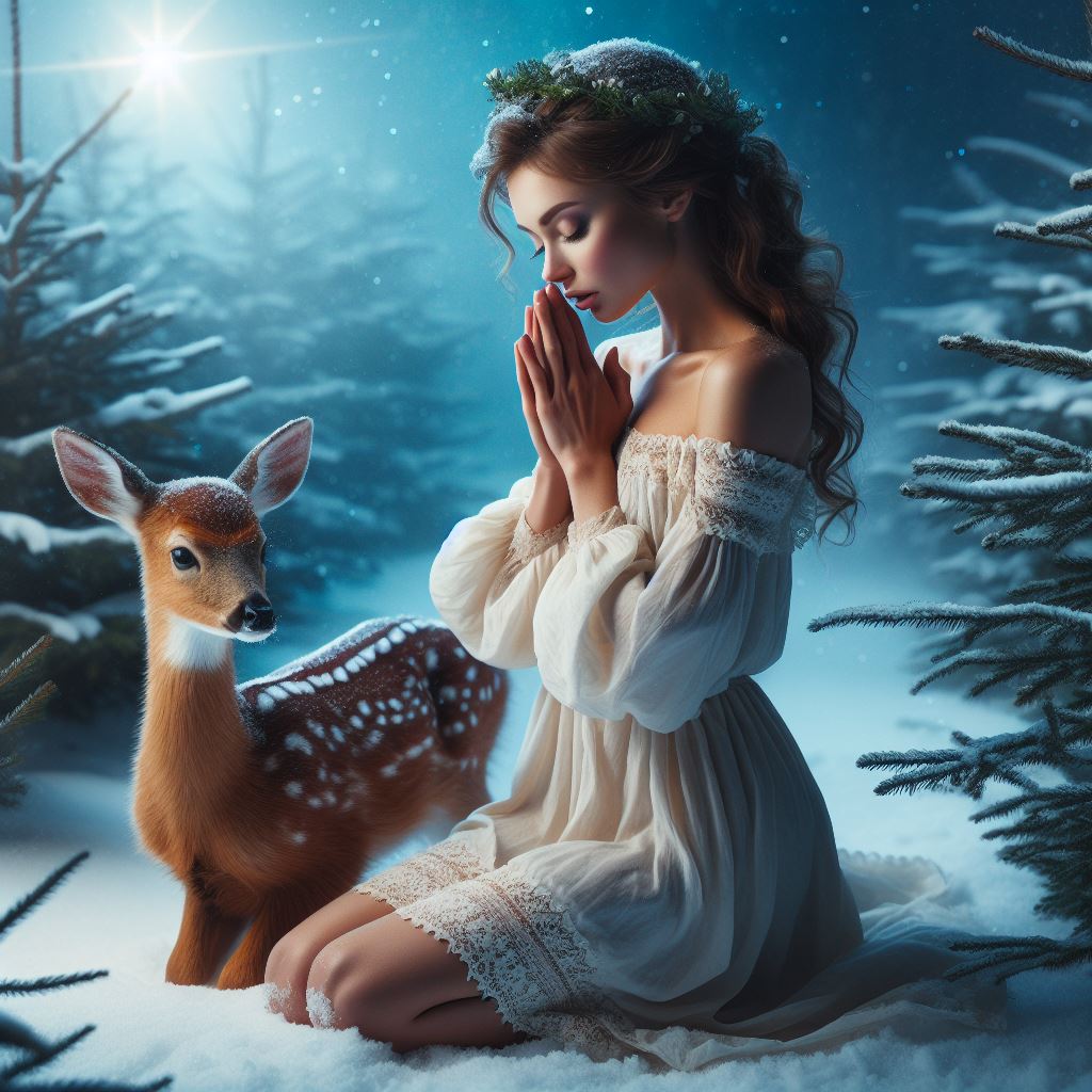 Gewisse Dinge und Begebenheiten sind auch nicht in Worte zu fassen, weshalb die Kunst auch durch Bild und Ton einen umfassenderen Raum anbietet, um sich auszudrücken. Am 23.12.2021 fuhr ich durch eine komplett verschneite Landschaft nachts nach Hause, durch Wälder und serpentinenartigen Strassen durch Schluchten, Täler, vorbei an Hügeln, kleinen Dörfern. Mein Navi spielte etwas verrückt und ich hielt kurz an, um mich zu orientieren. Danach fuhr ich wieder los, mit normaler Geschwindigkeit auf vom Schnee geräumten Strassen. Als ich mich einer kleinen Siedlung näherte, hörte ich plötzlich eine innere Stimme, warnend, in deutlicher Dringlichkeit, ich solle nach der Abzweigung nach rechts bei der kleinen Häusergruppe unbedingt langsam fahren. Zu oft machte ich in meinem Leben die Erfahrung, wonach diese innere Stimme stets recht behielt, sodass ich getreu der Mahnung nur noch mit etwa 30 km/h weiter fuhr, mich kurz fragend, weshalb ich dies tue, denn auf solche Fragen gibt die Stimme keine Antwort. Dann ging es blitzschnell! Von links aus dem Wäldchen sprangen mehrere Rehe auf die Strasse und ist schneebedeckte Wiesland rechts vom Strassenrand und im Scheinwerferlicht des Autos sah ich ein Rehkitz, das keinen halben Meter vor der Kühlerhaube am Kotflügel vorbei huschte, als ich bereits eine Vollbremsung machte und alle Rehe wohlbehalten die Überquerung überstanden. Mit dieser äusserst geringen Geschwindigkeit war der Bremsweg auch enorm kurz, bis ich stillstand und mir bewusst wurde, dass ich mindestens ein Reh getötet hätte, wenn ich normale Geschwindigkeit (80 km/h) gefahren wäre. Diese Eingebung kurz zuvor muss eine Engelsstimme gewesen sein, das bin ich mir sicher. Es war ein Wunder, ein Weihnachtswunder; unvergesslich für mich, eben kaum in Worte zu fassen, denn meine Dankbarkeit, dass nichts passierte ist unendlich gross – und heute habe ich KI mit meinen Gedanken dazu gespiesen. Dieses grandiose Bild dieses knienden Engels und dem Rehkitz sind dabei herausgekommen: