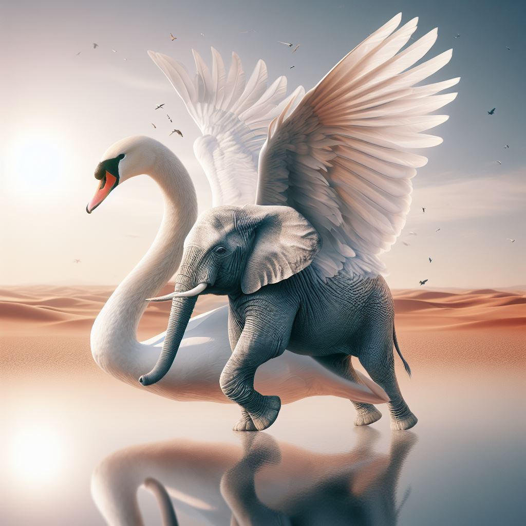 Das schamanistische Krafttier für Schönheit in Verbindung mit dem Elefant, wie es symbolisch auch in einem der surrealistischen Bilder von Salvador Dali vorgestellt wird. Heute mit KI (künstlicher Intelligenz) erschaffen.