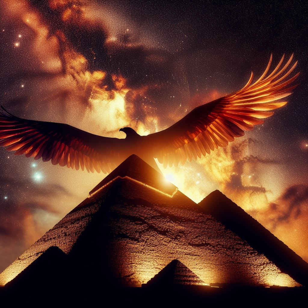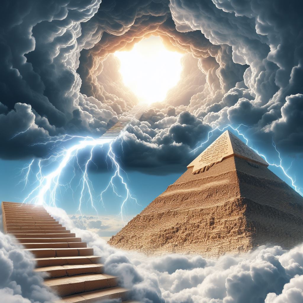 Da ich mich jahrelang mit Ägyptologie befasste, speziell mit der Periode des Pyramidenbaus im Alten Reich, kenne ich viele Texte, in denen es um den Aufstieg des göttlichen Pharaos in den Himmel als Horusfalke geht. Ich habe aber nicht nur dies versucht bildlich darzustellen, sondern auch die Vorstellung, dass die Pyramiden als eine Art Treppen ins Jenseits gegolten haben. „Möget ihr aufgehen im Lichtland, wo es euch wohl ist…“ heisst es in einem der alten Schriften.