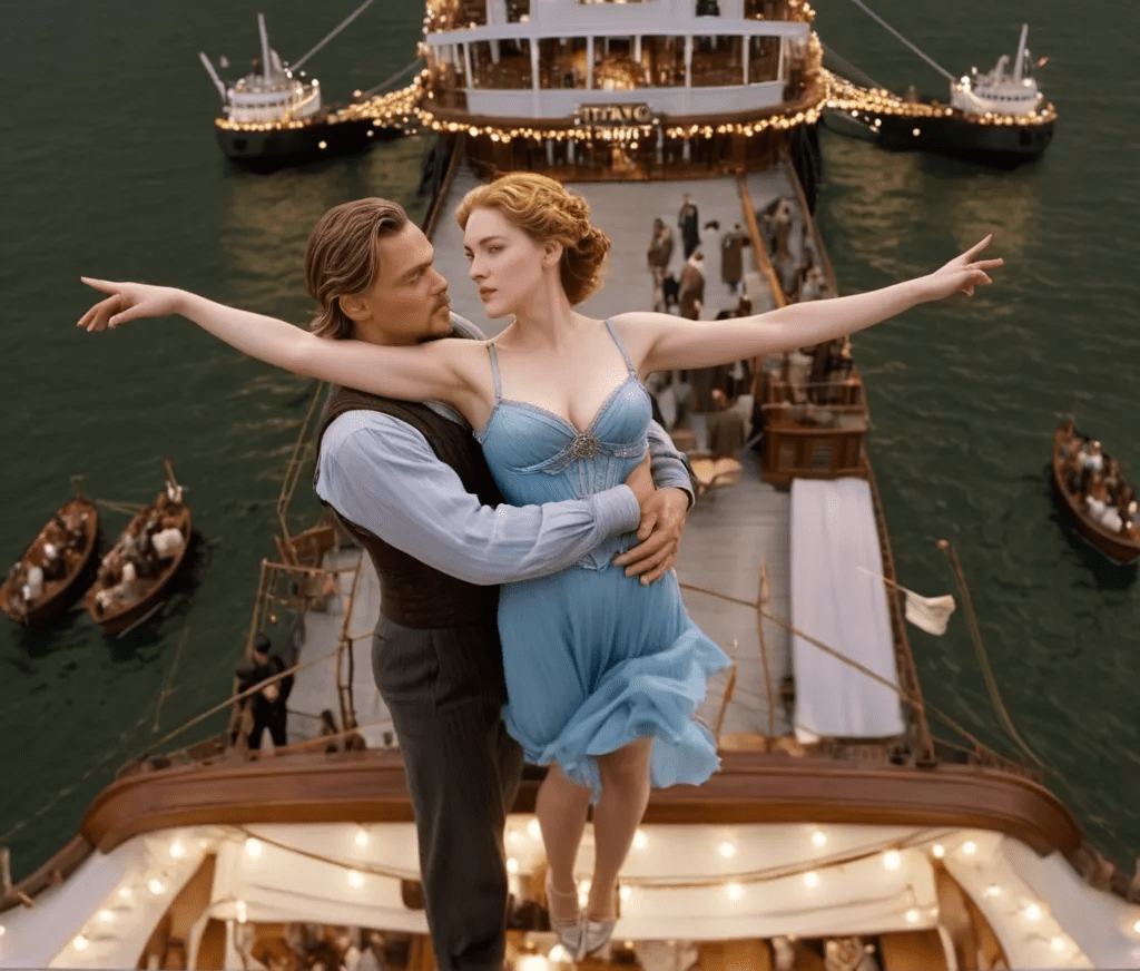 ….oder schliesslich völlig losgelöst von der ursprünglichen Vorlage, ohne diese Pose mit den ausgestreckten Armen, Jack und Rose per KI einen romantischen Moment schenken, in dem es nur so knistert!